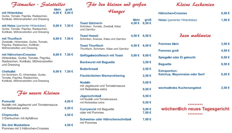 Unser Angebot reicht von frisch zubereiteten Klassikern wie Schnitzel, Pommes oder Salaten bis hin zu kleinen Leckereien für den schnellen Hunger. Auch für unsere jüngsten Gäste ist gesorgt – mit kindgerechten Speisen, die schmecken und satt machen.