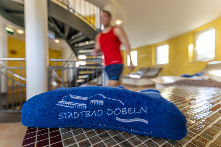 100% Baumwolle, Maße 100 x 180 cm, 450 g/m² mit Bordüre und Stick „Stadtbad Döbeln – und Sie werden staunen!“